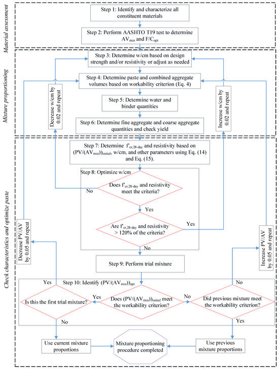 - A ten-step procedure to proportion concrete mixtures using the PV/AV method is presented in this work. This procedure emphasizes the need for the characterization of the voids in a combined aggregate system to minimize the CMC of concrete. The steps included in the new mixture proportioning methodology should significantly reduce the number of trial mixtures and also allow for the inclusion of SCMs conforming to or not conforming to the relevant specifications.