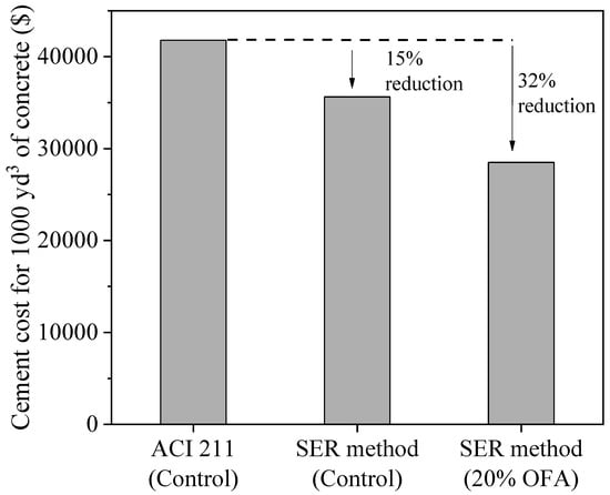 For the purpose of this study, 100 lb (45 kg) of bulk cement was assumed to cost USD 6. Figure 7 shows the cement cost comparison for these three mixtures. The results show that using the SER control mixture and the SER 20% OFA mixture can lead to 15% and 32% reductions in cement costs, respectively. This is attributed to the reduced cement content in the concrete mixture proportioned using the SER method. Differences in cost due to other items, such as aggregates, admixtures, and the transportation of constituents, are not significant (less than 5% of the overall cost) and hence are not included in Figure 7.