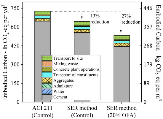 Figure 8 shows the carbon footprint comparison for the same set of concrete mixtures. It can be seen that the overall carbon footprint could be reduced by 13% and 27%, respectively, for the SER control and SER 20% OFA mixtures. This is also attributed to the reduced cement content in the two latter mixtures. Cement, in addition to being the most expensive ingredient, is also the most energy-intensive component in concrete. It can also be seen in Figure 8 that the cement is by far the largest contributor to the embodied carbon footprint in all three mixtures.