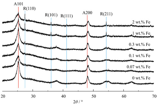 - Zhang, L.; Luo, X.; Zhang, J.D.; Long, Y.F.; Xue, X.; Xu, B.J. Kinetic Study on the Crystal Transformation of Fe-Doped TiO2 via In Situ High-Temperature X-Ray Diffraction and Transmission Electron Microscopy. ACS Omega 2021, 6, 965–975. [Google Scholar] [CrossRef] [PubMed]