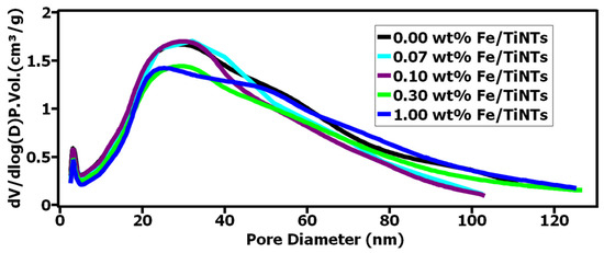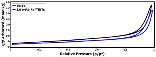 - The highest BET-specific surface area for the nanotubes was obtained for the pure TiNTs with 356 m2/g. As the wt% of iron in the samples increased, a decline in the values of BET-specific surface area of Fe/TiNTs was observed. Even though the doped samples showed lower surface areas than their undoped counterparts, their catalytic activity significantly surpassed the TiNTs, which highlights the beneficial nature of Fe3+ doping.