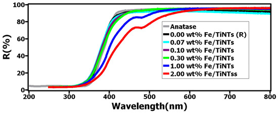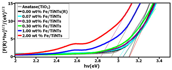 - A decrease in the optical band gap of Fe/TiNTs samples was revealed by DRS proportionally to the dopant concentration.