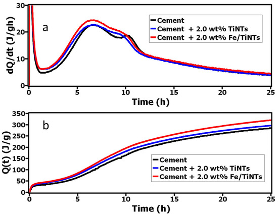 - An improvement in the hydration of Portland cement was observed in the presence of 2.0 wt% Fe/TiNTs compared to the references. The induction period was decreased and an acceleration was observed.