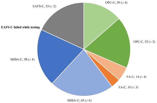 For the determination of particle size distribution (PSD) in each binder, a Mastersizer S analyzer (Malvern Instruments, Malvern Panalytical Ltd., Worcestershire, UK) was employed [40], utilizing ethanol as a dispersant, and subjected to 5 min of sonication before analysis. The samples of OPC, FA, and EAFS exhibited a comparable two-peaked distribution pattern. For both EAFS and OPC, the peak occurred at around 25 µm, although OPC displayed a more condensed peak in contrast to EAFS. Furthermore, these two binders revealed a reduced peak at around 0.35 µm, suggesting a notable abundance of extremely fine particles. The distribution of FA exhibited a comparable pattern, albeit with a broader distribution centred around 20 µm (peak). Similarly, FA exhibited a minor peak at 0.35 µm. On the other hand, MIBA displayed a slender peak at 39 µm, accompanied by a low peak at 0.35 µm.