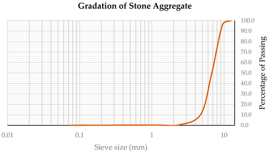 The Micro-Deval abrasion test determined the abrasion loss of the granite aggregates, as shown in Figure 9. The abrasion loss of the granite aggregate was found to be relatively high. The usual range for Micro-Deval abrasion loss is 17% to 20% [25]. However, the abrasion loss for the stone aggregate that has been used in the current PRP mixtures was found to be 22.25%, which indicates that this aggregate is not strong enough to ensure the strength of the PRP surface.