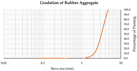 In this research, the Control Mix refers to the current mix that has been used commercially. Four new types of mixes were also tested in the laboratory, determined through factorial analysis. In these four new mixes, different proportions of stone aggregates, rubber aggregates, and polyurethane binder were used in the Control Mix. All mix proportions were calculated based on weight. The Control Mix consists of 45.25% stone aggregates (A), 45.25% rubber aggregates (R), and 9.5% polyurethane binder (B). New Mix 1 comprises 55% A, 37.5% R, and 7.5% B; New Mix 2 consists of 75% A, 17.5% R, and 7.5% B; New Mix 3 includes 55% A, 33% R, and 12% B; and New Mix 4 is composed of 75% A, 13% R, and 12% B. This approach facilitated a comprehensive evaluation of five distinct mix compositions. The polyurethane binder also can perform differently in the mixes if their types and sources are changed. Thus, four mixes with different types of the binder were also tested, where the proportion of the material in these mixes was kept the same as the Control Mix. The binders used were B1-aromatic for the Control Mix (in both cases, i.e., mixes with different compositions and mixes with different binders); and B2-aromatic, B2-aliphatic, and B3-aromatic for the other mixes. Aromatic binders containing Methylene diphenyl diisocyanate (MDI)-mixed isomers with aromatic parts absorb ultraviolet rays and turn yellow over time (known as ambering). This color change is cosmetic and does not affect the binder’s mechanical properties. Aliphatic binders lack aromatic parts and thus do not change color when exposed to ultraviolet rays, but they are typically pricier than aromatic ones [21,22]. New mixes and different binder types are listed in Table 1 and Table 2. All the mixes used the same rubber and granite stone aggregates. The particle size distribution of the stone aggregate is shown in Figure 1, while Figure 2 shows the distribution of the rubber aggregate. Through sieve analysis, it was found that a limited range of stone and rubber aggregates in PRP mixes ensures high permeability. Stone aggregates range mainly from 4.75 mm to 9.5 mm, while rubber aggregates range between 2.36 mm and 4.75 mm. The materials for this study were supplied by Stormflow Surfacing, Stratford, ON, Canada, our industrial partner.