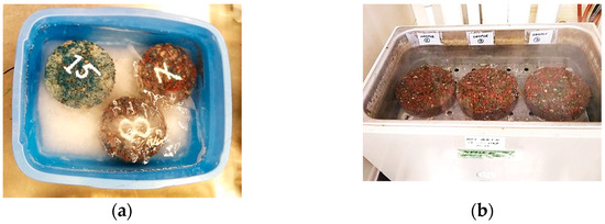 To assess the raveling resistance of samples with various mix compositions and binders, as well as unconditioned samples, a separate set of conditioned samples underwent testing. This included evaluating the impact of freeze–thaw cycles on the raveling resistance. The conditioning process followed a modified test method, involving subjecting a separate set of samples to specific conditions. Initially, a partial vacuum of 660 mm Hg (26 inches) was applied for 10 min to saturate the compacted samples to whatever saturation level was achieved. The saturated specimens were then submerged in water during freezing cycles to maintain their saturation. Each freeze–thaw cycle consisted of freezing the samples at −18 °C for 16 h, followed by thawing in 60 °C hot water for 8 h, completing one cycle. This freeze–thaw procedure was repeated five times for comprehensive testing [23,24]. Figure 4 shows the conditioning process of the PRP samples.