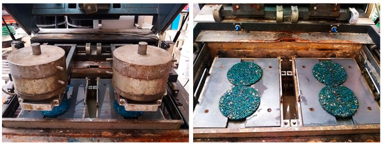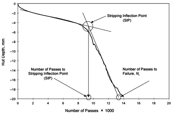 To evaluate the rutting, stripping, and moisture susceptibility of the compacted specimen, the Hamburg Wheel Tracking Test was used. The test was conducted in accordance with AASHTO T324-17. The permanent deformation rate from moving concentrated loads could be derived for the submerged samples through this test. This method is used to determine the premature failure of the sample mixture. The weakness of the aggregates structure, low binder stiffness, or moisture damage is the reason for this premature failure. The rut depth and the number of passes to failure are obtained through the test, and the stripping inflection point (SIP) could be calculated from those measurements, as shown in Figure 5. It is important to simulate real traffic on the pavement to get the actual result. The load applied on the Hamburg wheel tracking machine wheel is 705 ± 4.5 N (158 ± 1.0 lb) [26]. The test temperature is 53 ± 1 °C. Figure 6 shows samples under the wheel load of the Hamburg wheel tester and after removing the load.