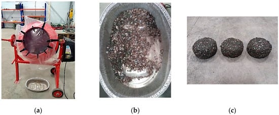 For laboratory testing, samples were manually prepared using custom-designed plastic molds based on test protocols. Mixing and casting occurred at room temperature (25 °C ± 1 °C) due to the minimal temperature impact on the polyurethane binder’s viscosity [17]. Stone and rubber aggregates were dry-mixed for 30 to 60 s, followed by adding liquid polyurethane for homogeneous mixing. Ten initial samples were tested for air voids to adjust charging amounts for achieving target ranges. Vegetable oil facilitated demolding. Compaction with a hand-held vibrator aimed to reduce air voids, but the results showed minimal impact, indicating that the air void content is composition-dependent. The empirical study concluded that each mix has a unique air void range determined by its composition. Consequently, we focused on testing the durability of different mixes based on this understanding without specifically discussing the air voids of each mix in the subsequent analyses. Figure 3 shows the equipment and molds used in sample preparation.