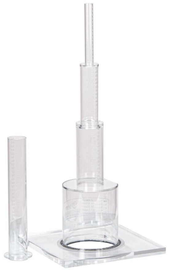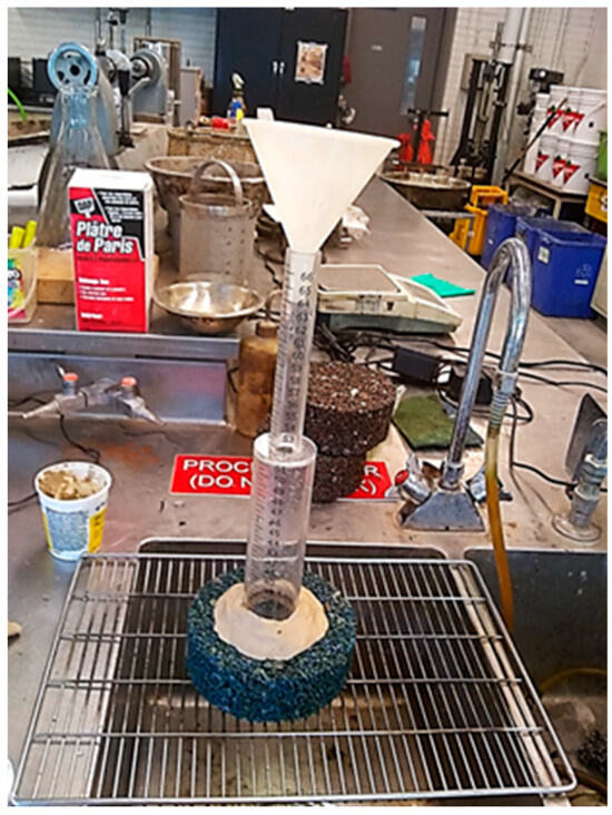 The permeability of the PRP samples was tested using an NCAT Asphalt Permeameter, as shown in Figure 8. ASTM-C1701/C1701M was followed to perform the test. In this research, we used a permeameter comprising four tiers made from transparent plastic material. The lowermost tier has the largest cross-sectional area, while the upper tiers show a gradual reduction in cross-section. The initial step in conducting the permeability test involves the temporary sealing of the permeameter at the surface of the samples. Subsequently, a specified mass of water is introduced into the ring, and the duration required for complete water infiltration is carefully measured. For this particular test, we consider the diameter of the second tier, which measures 15.52 cm2 [28,29].