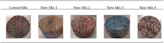 New Mix 2 contains the highest percentage of stone aggregates (75%), the lowest percentage of binder (7.5%), and a lower percentage of rubber aggregates (17.5%). Conversely, New Mix 3 has the lowest percentage of stone aggregates (55%), the highest percentage of binder (12%), and a relatively higher percentage of rubber aggregates (33%).