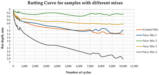 The PRP mixtures showed a good rutting resistance, as shown in Table 3. The average rutting deformation for the different types of mixes ranged from 0.3 mm to 2.8 mm. The results are demonstrated in Figure 10 and Figure 11. During the 10,000 cycles, some more considerable rut depths were found but were mostly temporary. The reason behind this behavior was that the PRPs are very flexible materials which possess an elastic behavior. Thus, deflection occurs during the loading conditions on the material’s surface; however, the deflection disappears when the load is removed. From the analysis of the laboratory test results, it is evident that there is a notable difference in the rutting performance among mixes. New Mix 4 exhibited the highest rutting depth of 2.8 mm, whereas New Mix 2 showed the lowest rutting depth of 0.3 mm. This observation can be attributed to the specific mix design characteristics of these two mixes.