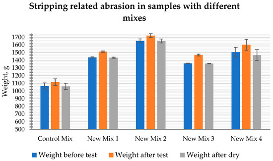 Due to rutting and moisture-induced damage, stripping-related abrasion was also found to be very small. It was found that moisture is absorbed by the stone aggregates of the samples. So, immediately after the test, the weight of the samples was found to be higher than the initial weight. However, after drying out the samples, there was little reduction observed in the weight of the samples, which ranges between 2.6% and 0.1%, as shown in Figure 12 and Table 4. The stripping-related abrasion observed aligns with the rutting and permanent deformation characteristics detailed in Section 3.2.1. Since New Mix 4 exhibited the highest permanent deformation (rutting), its stripping-related abrasion was correspondingly higher at 2.6%. In contrast, New Mix 2 and New Mix 3 showed lower permanent deformation and had the lowest stripping-related abrasion at 0.1% each.