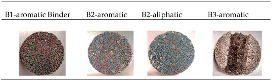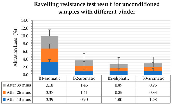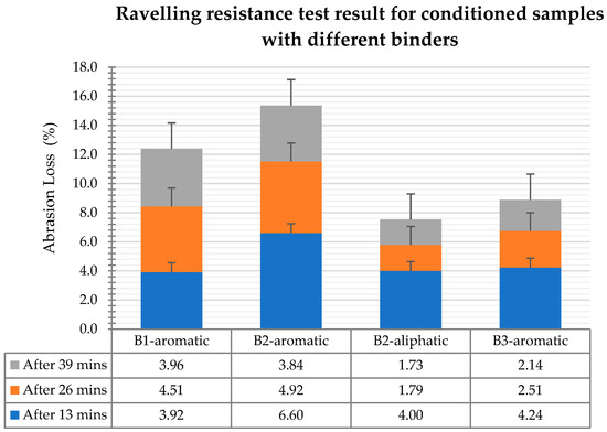 The test results showed that the B2-aromatic binder deteriorated more than the other binders after freeze–thaw conditioning. In unconditioned samples, the highest abrasion loss was found in samples with the B1-aromatic binder (9.94%) and the lowest in the samples with B2-aliphatic (2.75%). Unconditioned samples with B2-aromatic showed an abrasion of 3.76%. After conditioning, samples with B2-aromatic showed a very high abrasion loss of 15.37%. However, all other samples with different binders showed an increased abrasion loss after conditioning the sample. For the B1-aromatic binder, this loss was 12.4%, for B2-aliphatic, it was 7.53%, and for B3-aromatic, it was 8.89%. In both the conditioned and unconditioned samples, the sample with the B2-aliphatic binder showed a better performance. The test results for the raveling resistance for the conditioned and unconditioned samples with different binders are shown in Figure 18 and Figure 19, respectively.