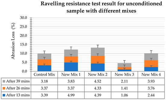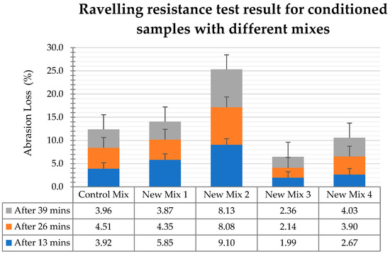 - The study evaluates the raveling resistance of samples with different mixes in conditioned and unconditioned states. The results showed that New Mix 2 had the highest abrasion loss at 25.31% and 13.23% for the conditioned and unconditioned samples, respectively, while New Mix 3 had the lowest at 6.49% and 4.54%. New Mix 2’s higher stone aggregate and lower binder content led to a weaker integration and increased raveling. In contrast, New Mix 3, with a lower stone aggregate but higher binder and rubber content, improved adhesion and bonding, which is crucial for reducing raveling during testing.