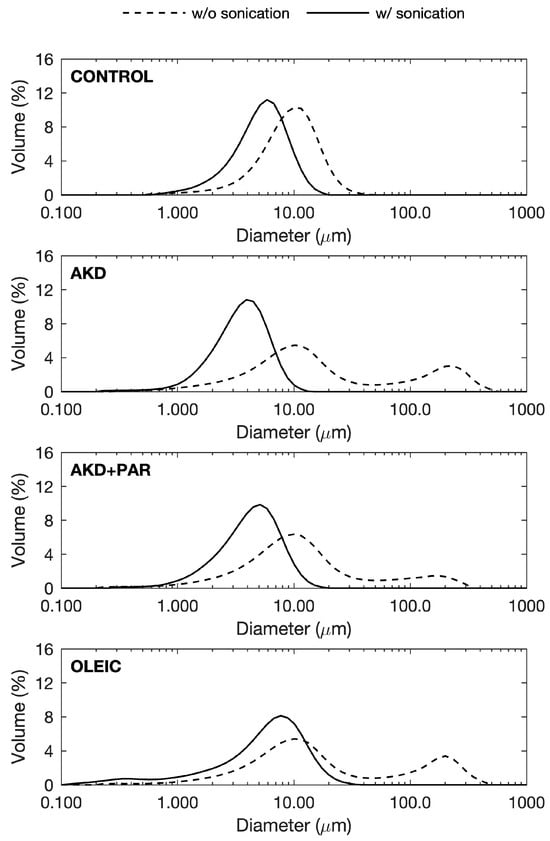 Canadian Standards Association Type HE [49] cement from Ash Grove in Mississauga, Ontario, Canada, was treated with hydrophobic additives (Table 1) by milling in an attrition mill for 4 min. Cement density (Table 1) was measured once for each sample by a helium pycnometer (Quantachrome SPY-4, Boynton Beach, FL, USA). The particle size distributions were performed on single samples by laser diffraction (Horiba LA960, Kyoto, Japan), first without employing sonication and again with sonication, to provide an assessment of the extent of agglomeration. (Figure 1).