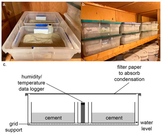 Cements in containers within the humidity control box with the lid removed (a), sealed boxes in a heated room (b), and a diagram of the set-up (c).