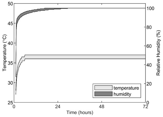 The treated cements and control cement were first poured into pairs of plastic containers (34 × 21 × 10 cm) filled to depths of 4 to 5 cm, yielding ~2.5 kg of cement per container. These open containers were in turn placed inside large plastic boxes (37 × 54 × 15 cm), with the containers supported by thin plastic grid panels immersed in tap water. Temperature and humidity probes (Lascar EL-USB-2, Whiteparish, UK) were inserted in the space between the containers. The interior sides of the lids for the large plastic boxes were covered with filter paper (Whatman Grade 93, Marlborough, MA, USA) to absorb any condensation that might occur during storage in sealed conditions and prevent water from dripping directly onto the cement (Figure 2). The boxes were stored in a 37 ± 2 °C room. It took ~6 h for the boxes to achieve an equilibrium temperature and ~24 h to achieve an equilibrium relative humidity (RH) of 95–100% (Figure 3). The cements were sampled initially (without accelerated aging) and after 1, 2, 4, 8, and 12 weeks of accelerated aging.