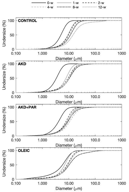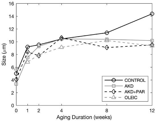 The cements exhibited an increase in particle size as the aging duration increased (Figure 6). Overall, the control cement showed the greatest increase (Table 2).