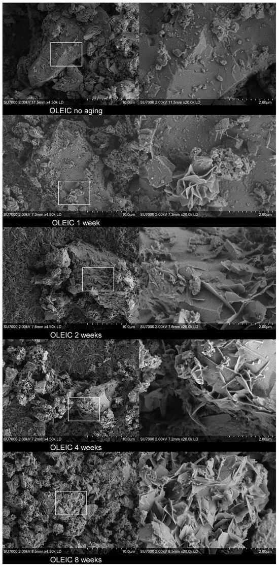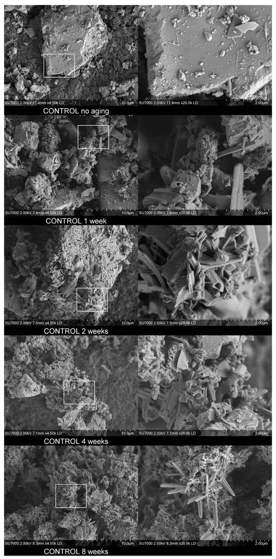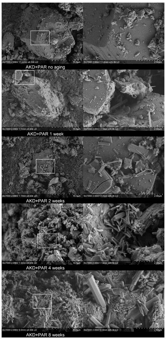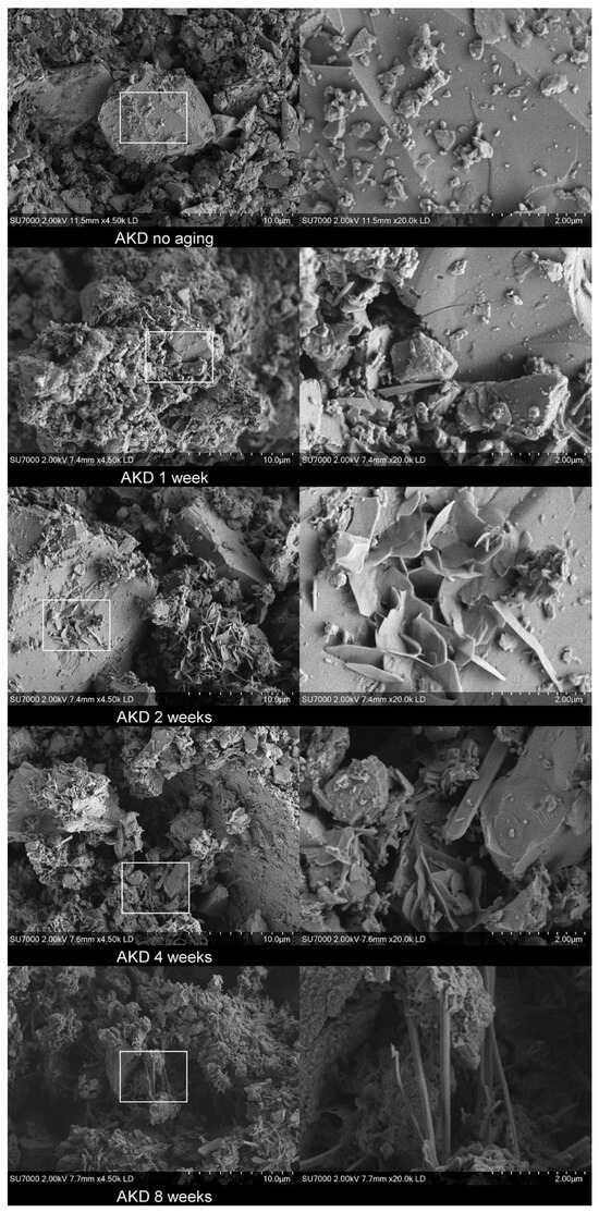 The observed coarsening of particle sizes as accelerated aging progresses is due to the binding of neighboring cement particles with hydration phases. At one week of aging, the control cement exhibits slender rods, likely Ca6Al2(SO4)3(OH)12·26H2O (ettringite), on the order of 10 μm in length bridging adjacent particles (Figure 7). Even prior to the accelerated aging regime, similar rods appear, but much smaller in size, on the surface of the large cement grain (Figure 7). After continued aging, occurrences of ettringite intensify, together with bladed laths, possibly mixed Ca(OH)2 (portlandite), and calcium silicate hydrates (C-S-H). The same pattern occurs for the treated cements (Figure 8, Figure 9 and Figure 10), but at 1 week of accelerated aging, the treated cement particles exhibit fewer instances of hydration products as compared with the control (Figure 7) and are without evidence of prehydration prior to the start of the accelerated aging regime. After 2 weeks, for the treated cements, hydration products are present, but still to a lesser degree when compared with the control. At 2 weeks, the AKD + paraffin-treated cement appears the least affected by prehydration (Figure 9). At 4 and 8 weeks, all the treated cements exhibit abundant hydration products.