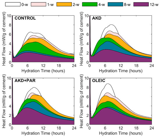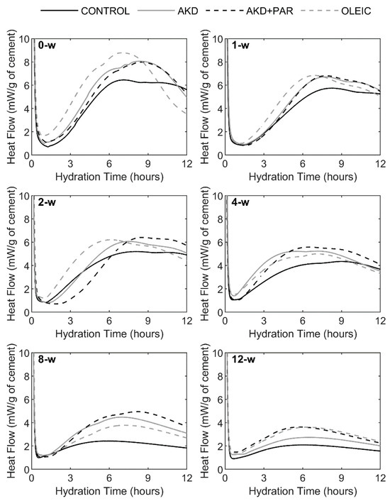 When compared with the paste made with the unaged cements, the induction period is shortened for all pastes made with the aged cements (Figure 23). Hartman and Plank [41] attribute this earlier onset of acceleration to coatings of ettringite, acting as seeds for further hydration reactions. They also attribute these coatings to the lower values observed for the initial silicate hydration peak, as the coatings may limit the access of water to silicate phases [41]. Many researchers have found that prehydration not only decreases the magnitude of the main hydration peak but also delays it [10,12,23,37,41,42]. This was not consistently the case here for the treated cements, where the main hydration peak occurred earlier in some instances, especially after extended aging of 4 weeks and beyond (Figure 11). A similar phenomenon was observed by Khigerovich [29] and Dvorkin and Dvorkin [32], who speculated that as prehydration advances, oleic acid may migrate towards the interiors of cement grains, prying open microcracks, exposing more surface area, and improving hydration. Similar wedging could also explain the earlier main hydration peak seen here for pastes made with the AKD and AKD + paraffin cements, but this hypothesis was not explored further.