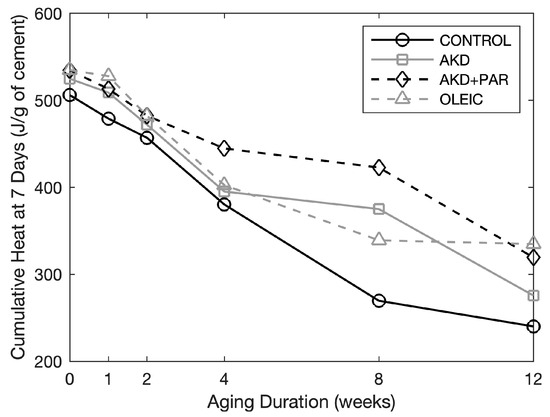 Changes in cumulative 7-day heat generation with increased cement aging.