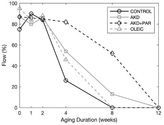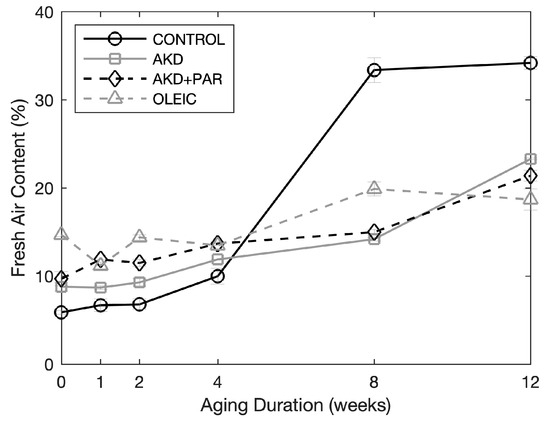 Flow was not dramatically affected up to two weeks of aging (Figure 13), but after four weeks, flow decreased significantly, although this was slightly less pronounced for the mortar produced with AKD + paraffin. At 8 weeks, there was a drastic drop in workability for all the mortars, but to a slightly lesser degree for mortars made with the AKD + paraffin and AKD-treated cements. The decrease in flow aligns with an increase in entrapped air (Figure 14). The tendency for fatty acid-based treatments to encourage air entrainment is well documented [34,35] and was confirmed here, with the mortar made with the oleic acid-treated cement showing the highest air content for unaged cement, followed by the mortars made with the AKD and AKD + paraffin-treated cements.