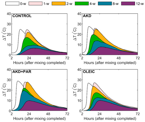 Unlike the pastes, the mortars made with the aged cements experienced a delay in the onset of the acceleration period and a delay in the achievement of the main hydration peak (Figure 24). One contributing factor could be the mortars’ considerably lower w/c of 0.38, as compared with that of the paste with a w/c of 0.5. The higher w/c of the paste would allow for better access to water. Another contributing factor could be the presence of the superplasticizer; Winnefeld [37] reported delays in the onset of the acceleration period for prehydrated cements in the presence of superplasticizers. As with the pastes, the extent of hydration decreases as aging increases, as indicated by the reduction in the maximum temperature achieved (Figure 25). Finally, for the AKD and AKD + paraffin-treated cements, although the hydration peak is delayed for the aged cements (Figure 24), at 4 weeks, it is delayed to a lesser degree than at 1 and 2 weeks, possibly reinforcing the “wax wedging” hypothesis [29,32].