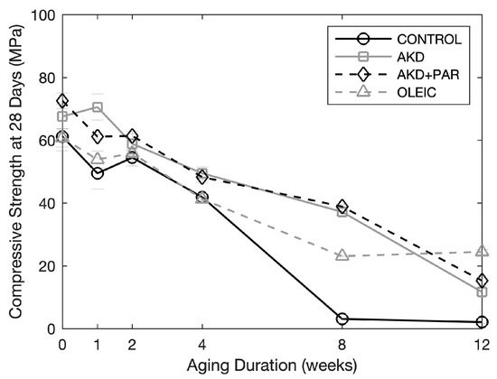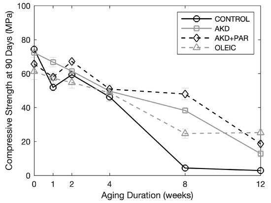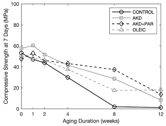 For all the mortars, the compressive strength decreases as the duration of accelerated aging increased (Figure 16, Figure 17 and Figure 18), but more informative trends can be observed when strength is expressed as a ratio between the mortars made with the treated cement and the mortars made with the control cement (Figure 19). The mortars made with the treated cements perform far better between 8 and 12 weeks of aging when compared to the control. But the strengths are more similar for the interval between 0 and 4 weeks of aging (Figure 20). For the AKD mortar made with unaged cement (prior to the accelerated aging regime), the strengths exceeded those of the control after 7 and 28 days of curing, but after 90 days of curing, the strengths were equivalent. For both the AKD mortar and the AKD + paraffin mortar made with cement that experienced 1 and 4 weeks of accelerated aging, the strengths exceeded the control.