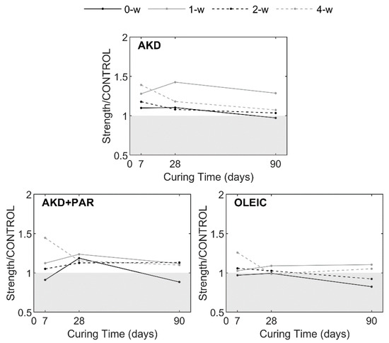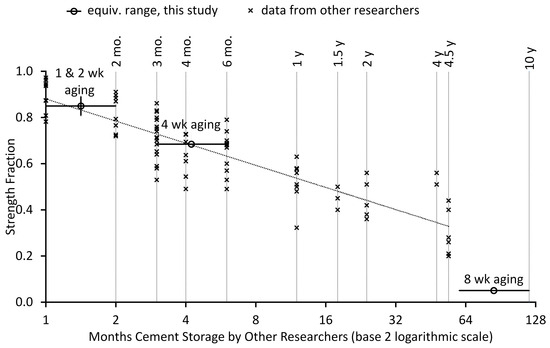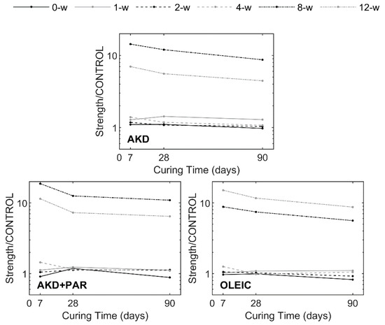 Ratio of compressive strength relative to the CONTROL with increased cement aging for durations up to 4 weeks.