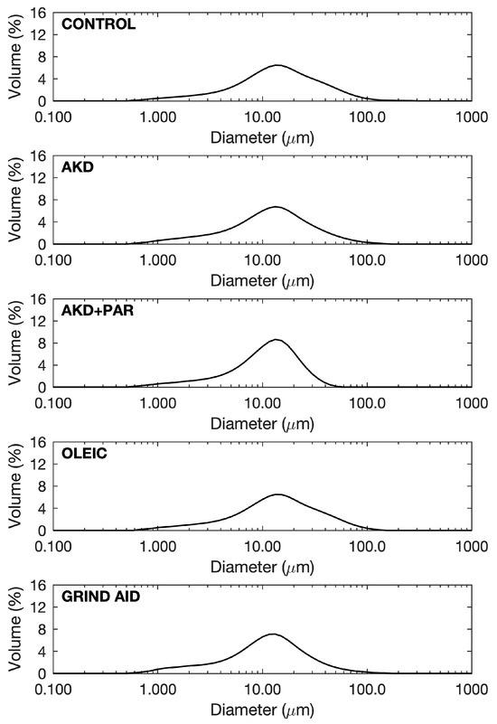 The particle size distributions after milling were similar (Figure 21) but with subtle differences. The control exhibited a slightly coarser particle size distribution (Table 3). Generally, a coarser particle size corresponds to lower values for a specific surface, but this was not the case for the control (Table 4). The milled AKD + paraffin-treated clinker and the oleic acid-treated clinker both exhibited surface areas slightly lower than the control. This unexpected result could be due to the agglomerations previously observed in the treated cements (Figure 1). However, this hypothesis was not tested as sonication (and the resultant disruption of agglomerations) was consistently employed for all particle size distribution trials.