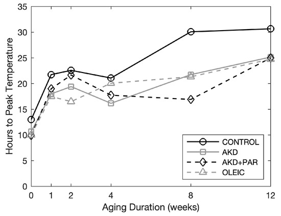 Time to peak temperature in the semi-adiabatic chamber with increasing duration of aging.
