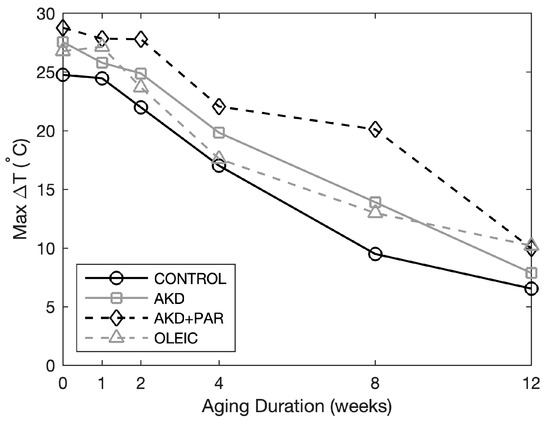 Peak temperature, expressed as the difference between mortar and room temperature, with increasing duration of aging.