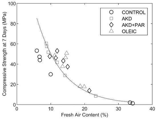 Across the board, as cement aging increases, mortar strength decreases. But the strength decrease is more dramatic for the mortars made with the control cement (Figure 16, Figure 17 and Figure 18). The drop in strength is most pronounced after 8 and 12 weeks of aging (Figure 19). Between 1 and 4 weeks of aging, the strengths of the mortars made with the treated cements are higher than the control, with the exception of the 90-day strengths (Figure 20). Abrams [1] reported that the negative effect of aging on strength decreases as curing times increase. Prior to the accelerated aging regime, the mortars made with both the oleic acid and AKD + paraffin-treated cements had lower 7 d strengths than the mortars made with the control cement (89% of the control for AKD + paraffin and 95% for oleic acid). The strength loss is due to higher air contents; 9.7 vol.%, and 14.7 vol.% for AKD + paraffin and oleic acid, respectively, as compared to the control at 5.9 vol.%. This loss in strength is not unexpected given the inverse relationship between strength and porosity (Figure 26) [55]. While the observed reduction in workability leads to poor consolidation and increased entrapped air, another contributing factor could be the tendency towards agglomeration and “lumps” as prehydration increases. Such lumps occur as cement particles become bound by prehydration products, entrapping air between neighboring grains—this entrapped air is not fully released during mixing [46].