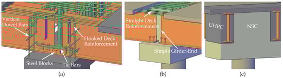 Seismic connection detail for SDCL steel bridges: (a) NSC connection; (b) UHPC connection—girder-end and reinforcement detail; and (c) UHPC connection—optimized use of UHPC.
