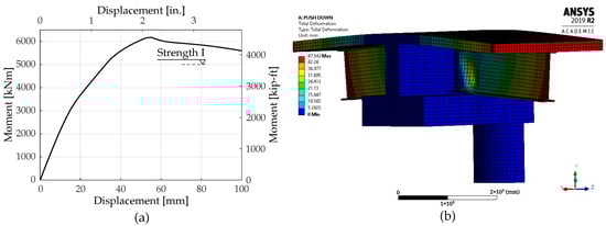 A series of analyses were conducted to determine the validity of the models using the assumptions and material models discussed above. The validation process employed different experimental results from the non-seismic SDCL connection development stages using NSC and a large-scale UHPC experiment. The results from the developed model using the described assumptions were compared with the experimental results in terms of both local and global responses. Mesh sizes ranging from 50 mm (1.97 in) to 100 mm (3.94 in) were examined to investigate the mesh sensitivity of the material model. The impact of mesh size on the load–displacement curve was negligible, attributed to the mesh-insensitive concrete material models used. Thus, the current study utilized a 100 mm (3.94 in) mesh size across all models to reduce computational cost.