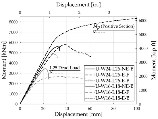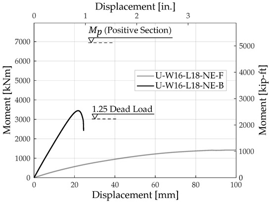 D-W16-L18-NE-F results: (a) moment–displacement response, (b) failure mode.