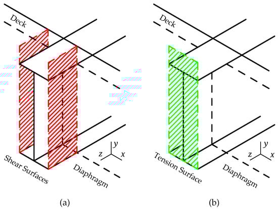 The failure surfaces under push-up loading: (a) shear surfaces (shown in red) and (b) tension surface (shown in green).