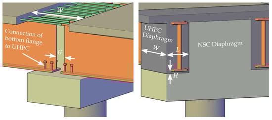 Figure 1b,c. The components of this connection are essentially similar to the NSC detail, but owing to the superior properties of UHPC, the detail for non-seismic applications is simplified. For this detail, the diaphragm will be partially precast with NSC, and the remaining parts will be cast in place with UHPC. The live load continuity reinforcement is developed in the UHPC using straight detail with a shorter development length, eliminating the need for a 90° hook in the NSC diaphragm. The girder-end detail is simplified, and no end-plates are required. Also, the steel blocks at the bottom flanges are eliminated. The girders must be seated at a height and with a gap at the end of them so that the UHPC is cast under the girder and between the two girders that are made continuously to ensure the full development of the compression strut within the UHPC. One of the main differences is that the cast-in-place portion of the UHPC does not require additional reinforcement.