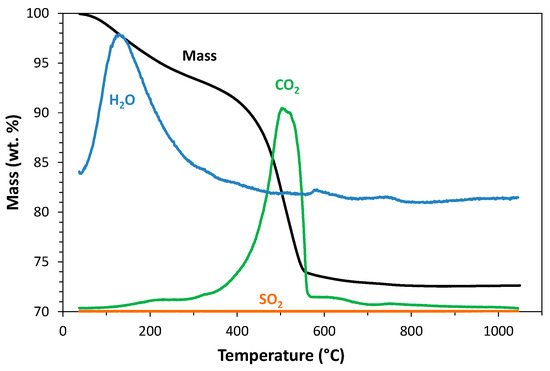 As some elements could not be analyzed by ICP-AES (such as hydrogen, carbon, nitrogen, etc.), thermogravimetric analysis coupled with mass spectroscopy (TGA-MS) was used to quantify the amounts of CO2, H2O, and SO2. It should be first noticed that the native slag did not exhibit any significant mass loss up to 1000 °C (<0.5%). Only two compounds were responsible for the mass loss on the carbonated samples: water and carbon dioxide. The loss of water occurred mainly between 30 and 300 °C, whereas decarbonation occurred from around 300 °C to 700 °C, as shown in Figure 2. Table 4 summarizes the corresponding results. The L.O.I (30.3%) and the total TGA mass loss (27.4%) were slightly different; this small discrepancy could be ascribed to the difference in the final temperature (1000 °C for TGA and 1100 °C for L.O.I) and the fact that with L.O.I, there is a 1 h plateau at 1100 °C, whereas the TGA experiment ends when the sample reaches 1000 °C. The loss of water is likely related to hydrated amorphous silica, an expected product of the carbonation process of magnesium silicate minerals. A small loss of carbon dioxide was detected around 200 °C, which was probably due to the presence of organic residue from the carbonation process (the reactor including a PEEK liner).