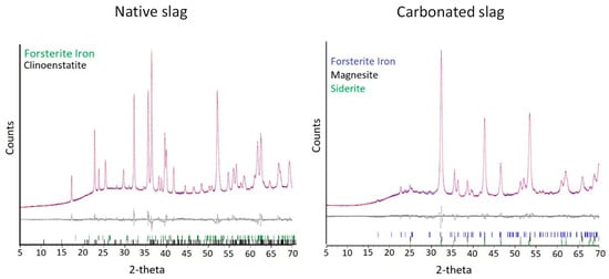According to these results, the native slag contains around 45% of forsterite, a small amount of enstatite, and 55% of amorphous materials. As for the carbonated slag, it contains about 7% of residual forsterite, 37% of magnesite, 4% of siderite, and around 50% of amorphous materials (see Table 5). For both samples, Rietveld refinements were accurate since the GOF was lower than 3.5 and the RWP lower than 5.