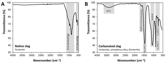 FT-IR spectra of (A) native slag and (B) carbonated slag.
