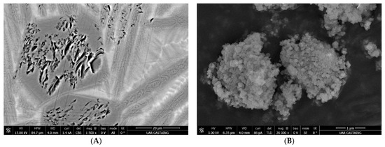 SEM observations were carried out on both the native and carbonated samples (Figure 6). The BSE of a polished section of resin-coated native slag (Figure 6A) made it possible to observe different morphologies: large particles which appear in the dark (therefore, made of light elements) and seem to be porous, needle-like particles containing crystallites, and a third phase, including the other two phases, which is lighter. In terms of composition, the results of EDS were inconclusive due to the intimate imbrication of the mineral phases. For the carbonated slag (Figure 6B), the SEM image made on a powdered sample showed that each grain was composed of an agglomeration of submicronic particles. Therefore, TEM observations were carried out to analyze both materials in greater detail.