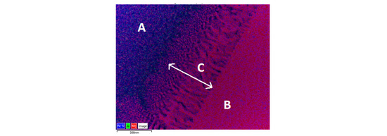- Area A, amorphous: Mg/Si = 0.41; Fe/Si = 0.21; Al/Si = 0.13. The Mg/Si ratio is very close to the one calculated with the mass balance (Section 3.2.2); the other two ratios are slightly higher with this technique. However, it confirms that aluminum is only detected in the amorphous phase.