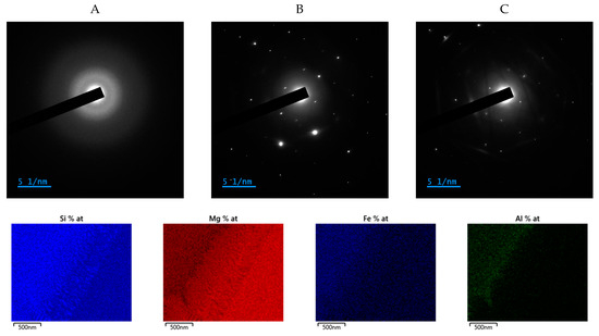 The electron diffraction mode in TEM was used to discriminate crystalline and amorphous phases (on the diffraction pattern, dots count for crystalline phases and halo ring for the amorphous phase) and the scanning mode (STEM) was used to determine the elemental composition of the three different highlighted zones, labelled A to C in Figure 7. As seen from the corresponding diffraction pattern, A is 100% amorphous and contains mostly silica (see elemental mapping at the bottom of Figure 7), while B and C are 100% crystalline but show different chemical compositions: B is mostly composed of magnesium, while C also contains a significant amount of silica. In addition to elemental mapping using STEM-EDS, quantitative EDS analysis was also performed pointwise on several areas for each sample.