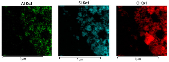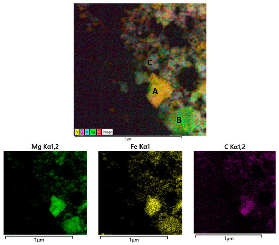 - Area A, crystalline, corresponds to carbonates and is mainly composed of magnesium, iron, carbon, and oxygen. As all EDS analyses revealed the presence of Mg and Fe in A, it was deduced that carbonates form a single mixed phase and do not separate magnesite from siderite. This is consistent with thermodynamic calculations, which indicate that the solid solution is the most stable [31]. However, the electron beam could not be correctly focused, and, therefore, EDS did not make it possible to verify the Mg/Fe ratio.