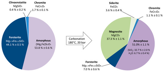 This type of material mostly includes magnesium silicates, either crystalline or amorphous. Therefore, its carbonation will likely result in the formation of magnesium carbonate and amorphous silica [17].