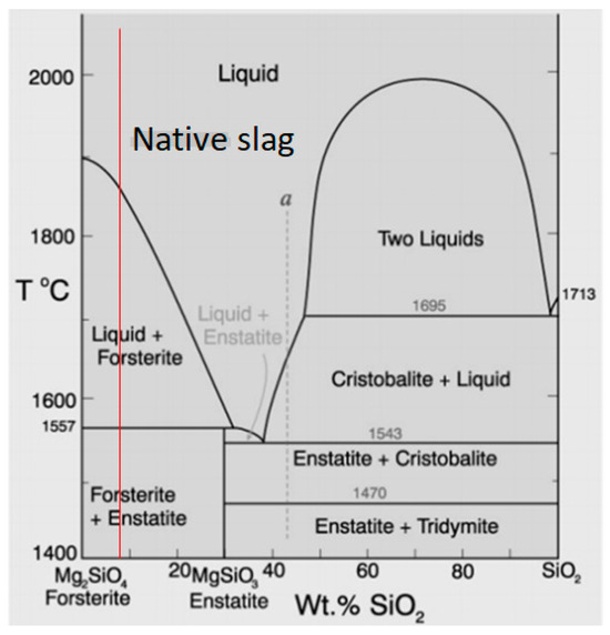 Phase diagram of forsterite and silica [33]. Vertical red line stands for the native slag.
