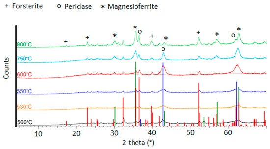 The carbonated product contains amorphous silica but also magnesium carbonate, which could form magnesium oxide (periclase) after heating. Yet, magnesium silicate binders are prepared from a mixture of magnesium oxide and amorphous silica [37]. Therefore, the carbonated product could be a precursor of the synthesis of magnesium silicate binders. Preliminary experiments were carried out to determine whether it is possible to synthesize periclase (MgO) and within which temperature range. The decarbonation of magnesite starts from 500 °C (Figure 12); between 500 and 600 °C, magnesite is transformed in periclase, but at higher temperatures, only magnesioferrite (MgFe2O4) is formed. Then, to prepare a silico-magnesium binder, it is necessary to maintain the processing temperature between 500 and 600 °C.