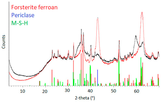 Finally, a paste was prepared with a material prepared after treatment for 1 h at 600 °C, using a liquid-to-binder ratio of 1.2. After 7 days, the paste was characterized by XRD (Figure 13), and the presence of M-S-H was confirmed. These results are very promising, and a further study will be carried out.